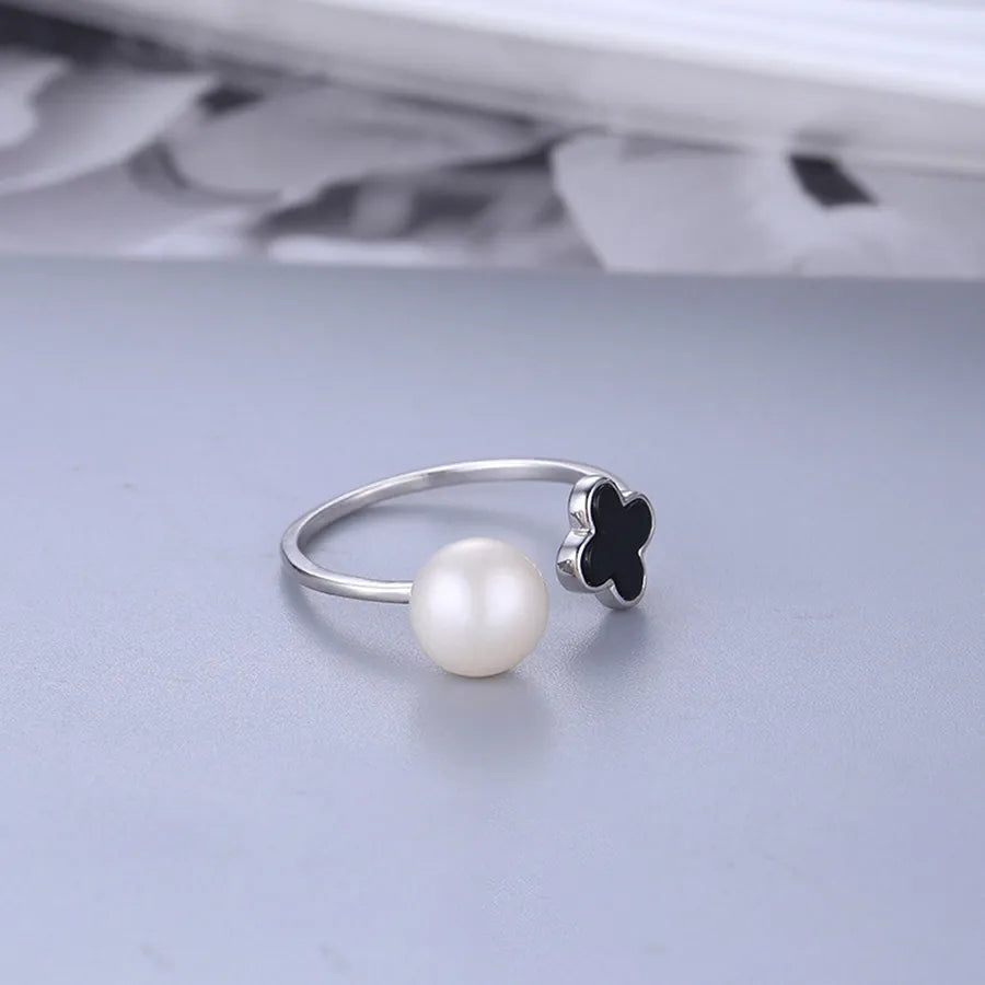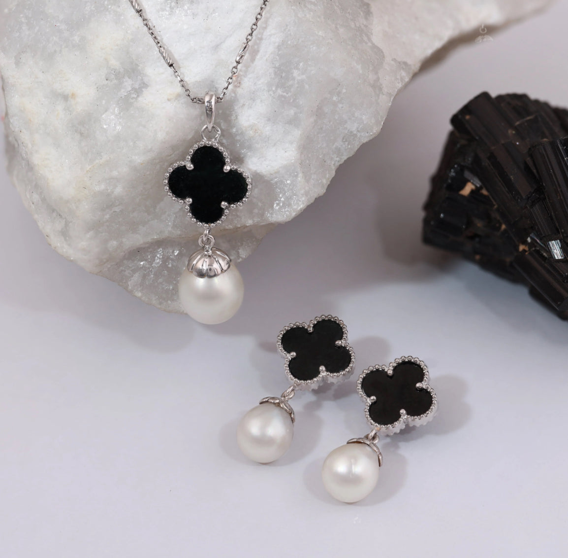 Set de Perlas trébol negro: Collar, Aretes y Anillo